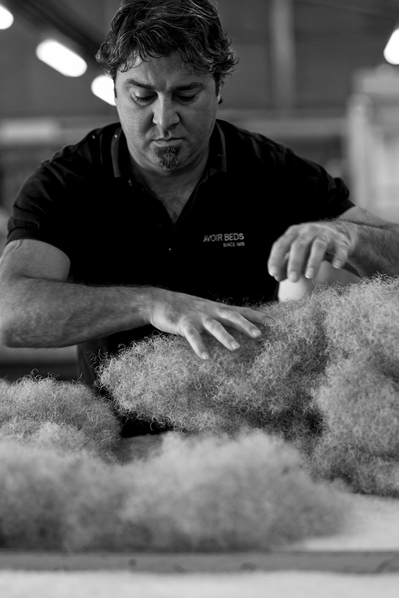 一层手工梳理的松软长马尾毛,让支撑力与舒适性更上一层楼。 随后,运用羊毛簇绒将被套料与包覆弹簧的麻布相连, 确保填充材料分布均匀。